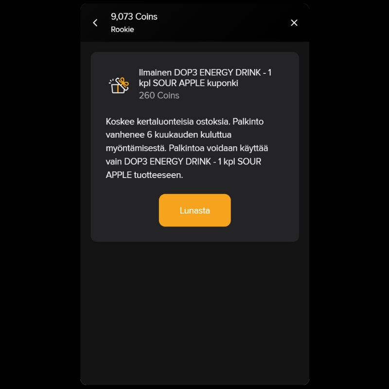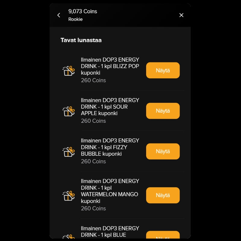 Kiipeä tasoja ja nappaa matkan varrelta spesiaalipalkintoja! Kun ostat tarpeeksi ja nouset uudelle tasolle, saat kertapalkintona jotain extraa – aina Coinseista ja ilmaisista tuotteista isoihin lahjakortteihin. Mitä kovemmin grindaat, sitä kovemmin droppaa.
