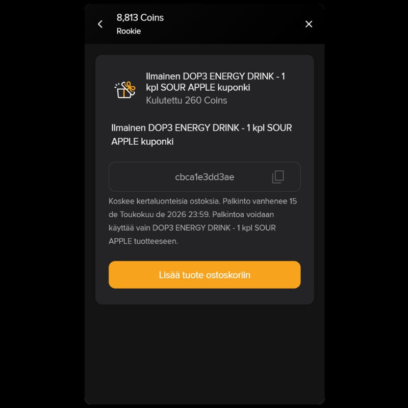 Saat alennuskupongin. Kopioi se ja lisää tuote ostoskoriin painamalla "Lisää tuote ostoskoriin".
